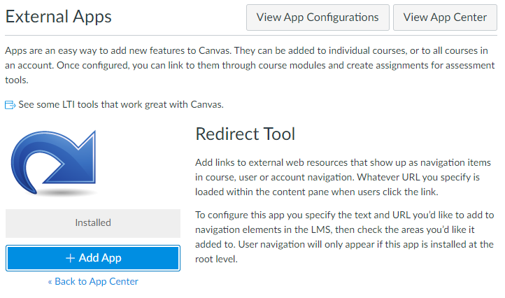 In your Canvas course, click on the Settings menu option and then the Apps tab. What you’re looking for is an app called Redirect. Easiest way to find it is to start typing Redirect into the search box and it should show up.